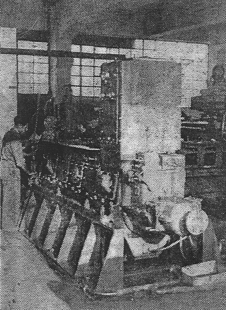 Fotos: Don Gerardo Echevarría, fundador. Motor de 300 caballos construido en Bermeo para un remolcador de matricula en Cádiz. (Fotos Oliver)
